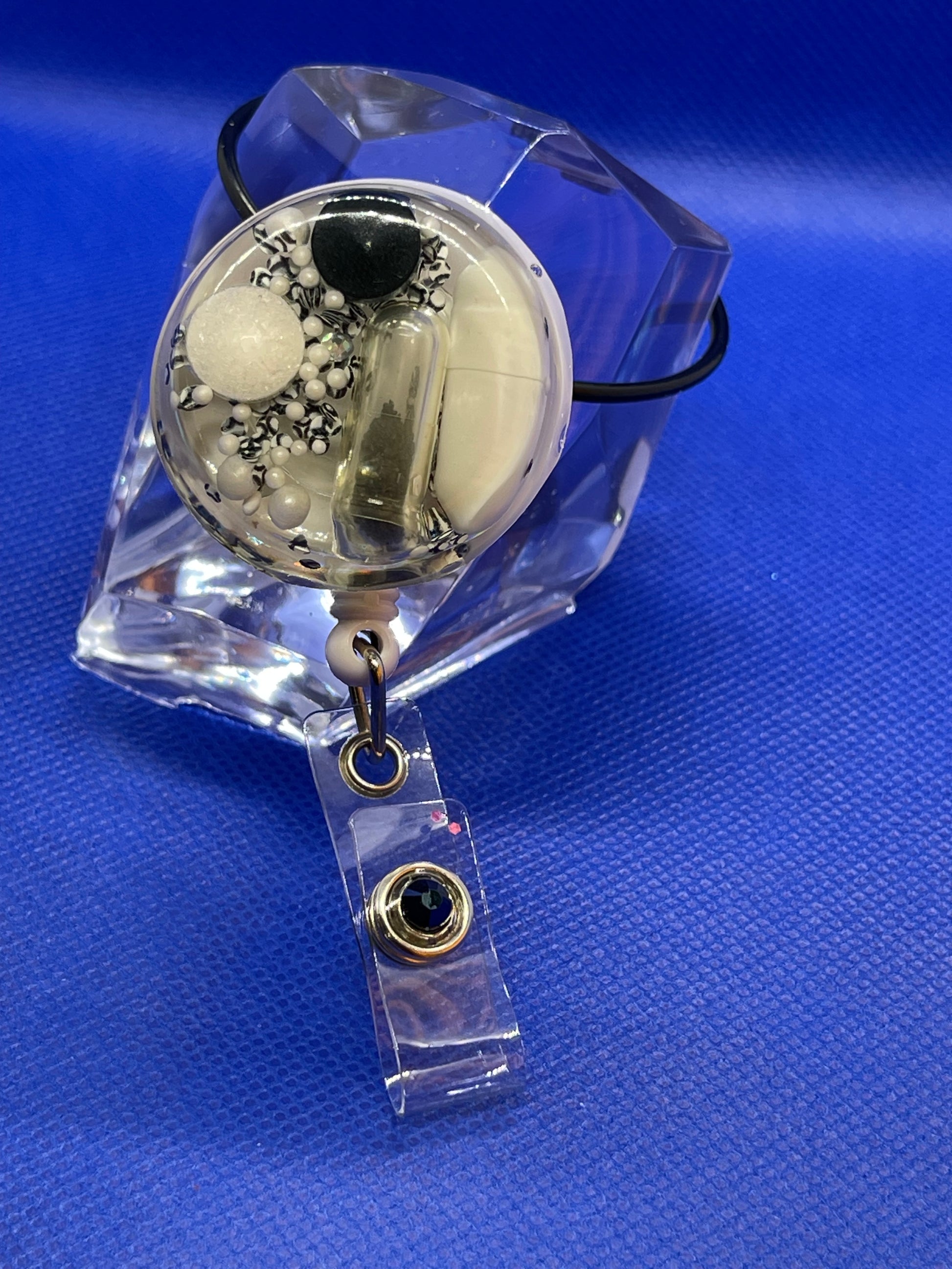 Black and White Happy Pill Badge Reel with black and white sprinkles. Alligator clip pocket attachment on white reel. Sapphire rhinestone gemmed retractable reel.